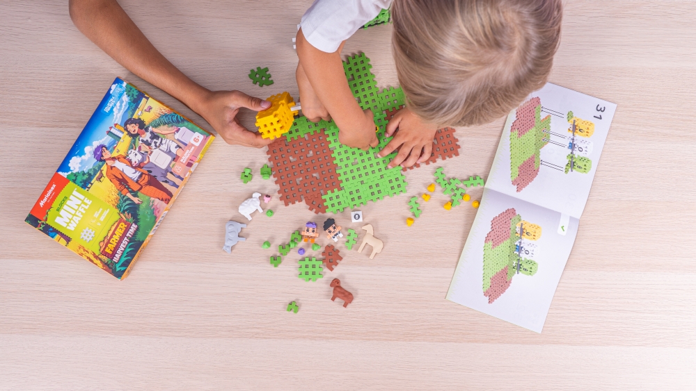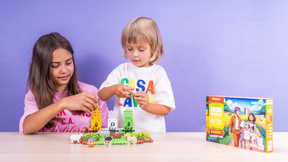 Zestaw Mini Waffle Farmer – Czas zbiorów 100 zaprasza dzieci do świata wielkich żniw i wiejskich obowiązków. Zbuduj trzy kolorowe silosy – na mleko, kukurydzę i zboże – oraz odtwórz farmę z jej naturalnym rytmem. Kto dziś przewozi zbiory, a kto karmi zwierzęta? Wszystko zależy od Ciebie!