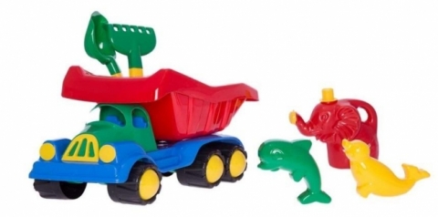 Samochód z akcesoriami do piasku. W zestawie znajduje się: konewka, grabki, łopatka oraz 2 foremki. Komplet zapakowany w siateczkę. Wymiary pojazdu: 47/23,5/25 cm. Kolory mogą różnic się od przedstawionych na zdjęciu.