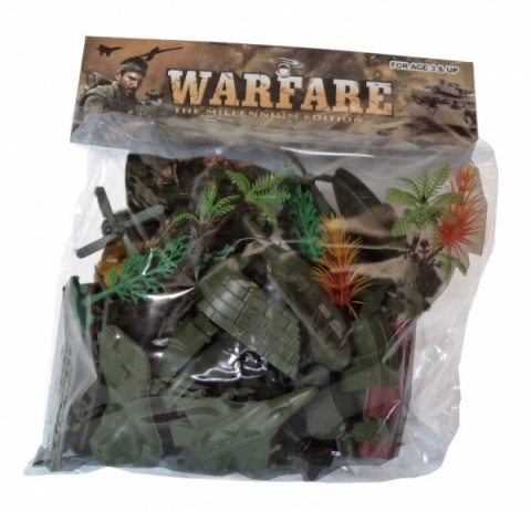 Zestaw militarny z figurkami żołnierzy, pojazdami i elementami otoczenia. Do zestawu dołączona jest mapa.