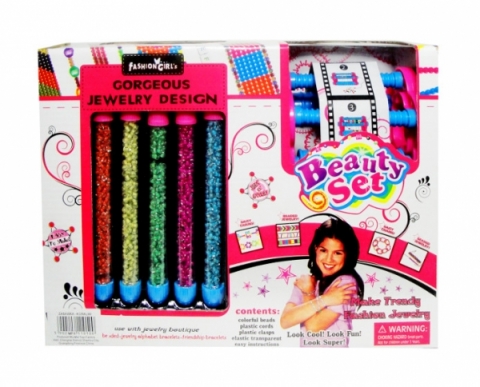 Zestaw do robienia bransoletek dla dziewczynek. Zawiera: kolorowe koraliki, kolorowe sznureczki oraz przyrząd, który pomoże nawlekać koraliki przy robieniu bransoletek.