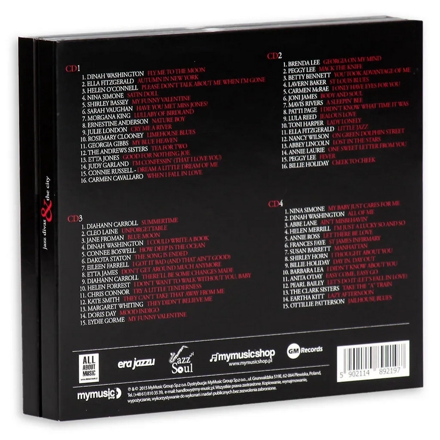 Nina Simone, Billie Holiday, Peggy Lee, Doris Day, Dinah Washington, Julie London, Shirley Bassey, Abbe Lane, Anita O’Day, Judy Garland i wiele innych wielkich nazwisk. „Jazz Divax” to doskonała propozycja zarówno dla pasjonatów muzyki jazzowej, jak również dla tych, którzy dopiero zaczynają swoją przygodę z jazzem. W odróżnieniu do poprzedniego cyklu „& The City”, wyselekcjonowane utwory zostały umieszczone tym razem na czterech płytach.