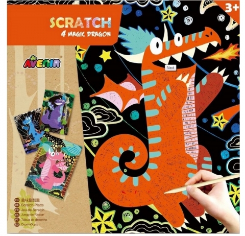 Wyjątkowy arkusz, na którym tworzy się poprzez zdrapywanie warstwy wierzchniej, by odsłonić wielobarwną warstwę spodnią. W zestawie są 4 magiczne smoki oraz patyczek do zdrapywania.