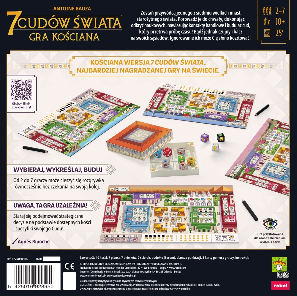 7 Cudów Świata: Gra kościana to wyjątkowa adaptacja najbardziej nagradzanej gry na świecie. Podczas zabawy będziemy używać kości do budowy swoich miast. Aby zwyciężyć, będziemy musieli podejmować strategiczne decyzje, biorąc pod uwagę dostępne opcje oraz specyfikę swojego cudu.