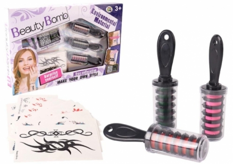 W zestawie znajdują się trzy kredy do włosów w intensywnych kolorach oraz bogaty zestaw zmywalnych tatuaży o różnych wzorach od kwiatowych i fantazyjnych po nowoczesne motywy geometryczne. Kredy są łatwe w użyciu, nie brudzą rąk i zmywają się po jednym myciu, a tatuaże można w prosty sposób usunąć wodą lub oliwką.