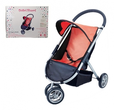 Wózek spacerowy dla lalek z trzema kołami, składany, w kolorze czerwono-czarnym. Wyposażony w daszek i koszyczek na drobiazgi. Zabawka przeznaczona dla dzieci od lat 3 Zapakowany w kartonowe pudełko. Wymiary opakowania są wymiarami pudełka.