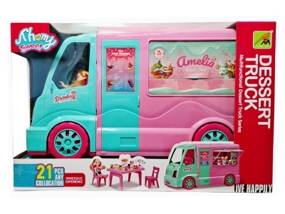 Kolorowa ciężarówka lodziarnia z akcesoriami do zabawy. W zestawie znajduje się samochód, lalka, stolik, krzesełka i elementy do odgrywania scenek. Łącznie aż 21 elementów. Zabawka przeznaczona dla dzieci od lat 3. Produkt zapakowany w kartonowe pudełko. Podane wymiary są wymiarami opakowania.