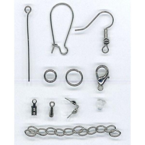 szpilki jubilerskie z łepkiem (gwoździe) 35mm - 15szt., haczyki jubilerskie 35mm - 15szt., bigle zapinane 11x24mm - 8szt., bigle otwarte 18x19mm z kulką i sprężynką - 8szt., czapeczki ozdobne do koralików O7mm - 30szt., zapięcie karabińczyk 13x7mm - 6szt., kółko O8mm - 6szt., kółko O6mm - 30szt., łapaczka końcówka zaciskowa - 15szt., łapaczka dziewczynka - 15szt., zawieszka do przedłużki łańcuszka 8szt., przedłużka łańcuszka 4,5-5cm - 5szt., zatyczka silikonowa do kolczyka - 30szt.