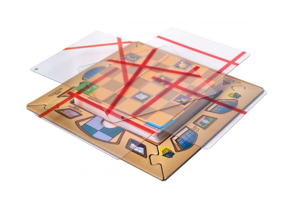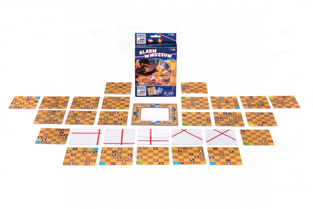 Alarm w muzeum to łamigłówka logiczna wykorzystująca przezroczyste karty, które będziemy na siebie nakładać, tworząc wzory zabezpieczeń. W pudełku znajdziesz 64 zadania o rosnącym poziomie trudności, które będą nie lada wyzwaniem dla małych i dużych umysłów.