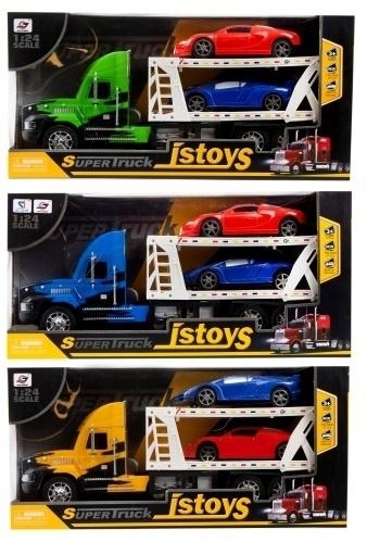 Olbrzymia naczepa przewozi dwa eleganckie sportowe samochody. Opuszczana rampa pozwala na umieszczenie pojazdów w środku. Produkt wykonany z plastiku.