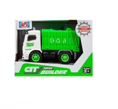 Zabawkowy samochód śmieciarka. Pojazd wydaje dźwięki oraz posiada sygnały świetlne.