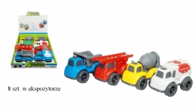 Małe plastikowe autka z napędem ciernym. W serii znajdują się autka budowlane i ratunkowe. Dostępnych jest 8 różnych wzorów. Zbierz je wszystkie aby mieć więcej frajdy z zabawy. Produkt dla dzieci od 18 miesiąca życia.