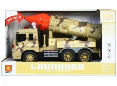 Samochód wojskowy posiada funkcje świetlne oraz dźwiękowe. Za pomocą przycisków, możemy zmieniać odgłosy wydawane przez auto. Dodatkową funkcją jest podnoszona i gotowa do wystrzału za pomocą przycisku rakieta. Samochód w skali 1:16. Wymagane zasilanie 3 bateriami AG13 - załączonymi do zestawu