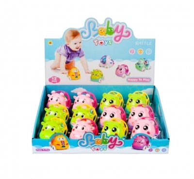 Kolorowy samochodzik w kształcie zwierzatka z grzechotką.