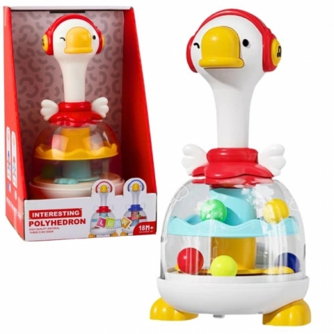 Bączek z kuleczkami w kształcie gęsi to wyjątkowa zabawka edukacyjna, która łączy w sobie prostotę obsługi i wielką frajdę dla najmłodszych. Po naciśnięciu głowy zabawki uruchamia się mechanizm obrotowy, który wprawia w ruch kolorowe kulki wewnątrz przezroczystej kopuły. Towarzyszą temu efekty świetlne i dźwiękowe, które skutecznie przyciągają uwagę dziecka i stymulują jego zmysły.