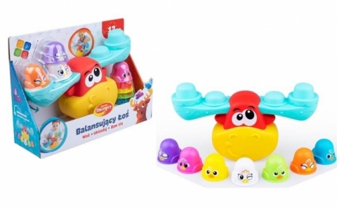 - zestaw składa się z równoważni w formie łosia i 7 kolorowych kubeczków - ptaszków.