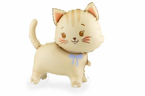 Balon foliowy Kotek na kółkach, w kolorze jasnobeżowym. Wymiary przed napompowaniem ok. 71 x 73 cm (28,0 x 28,7''), wymiary po napompowaniu ok. 61 x 65 cm (24,0 x 25,6''). Do napompowania powietrzem. Zestaw zawiera słomkę.