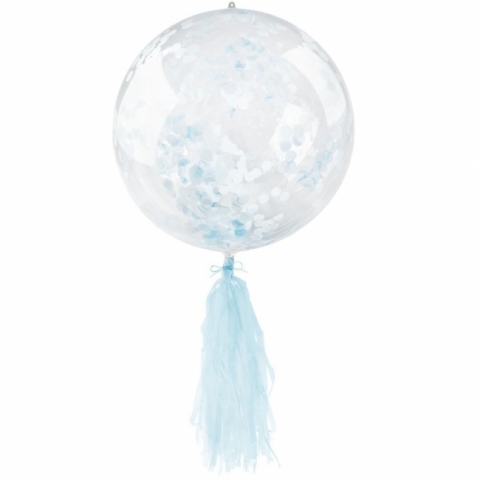 Zestaw dekoracyjny w kolorze niebieskim. W skład zestawu wchodzi transparentny balon pvc, papierowe niebieskie konfetti i frędzle. Duży balon wypełniony konfetti jest efektowną dekoracją przyjęcia. Wykończenie balonu lekkimi frędzelkami pięknie wygląda a pod wpływem podmuchu powietrza frędzelki delikatnie się ruszają. Balon można napełnić helem lub powietrzem. W przypadku wypełnienia powietrzem balon należy dmuchać pompką, na czubku balonu znajduje się małe oczko umożliwiające jego powieszenie. Dla uzyskania jak najlepszego efektu warto naelektryzować balon za pomocą suchej, miękkiej ściereczki, aby konfetti przyczepiło się do jego ścianek. Średnica balonu po napompowaniu to 45 cm. W opakowaniu znajduje się jeden komplet