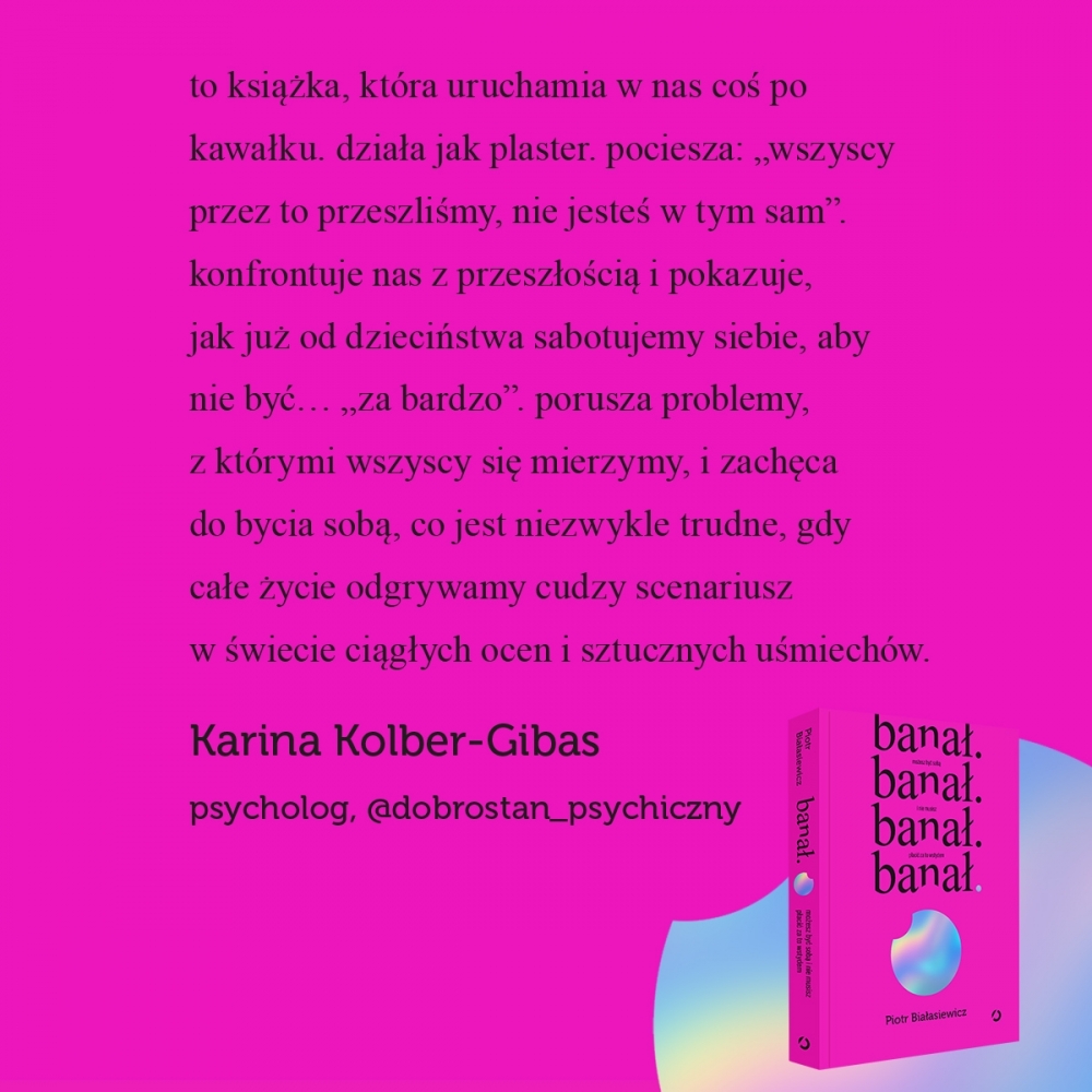 „banał” to nie poradnik i nie recepta na szczęście. to raport z wnętrza człowieka, który pół życia udawał, że ogarnia, a nie wiedział nawet, jak bez instrukcji włączyć pralkę. to książka o przedszkolach produkujących znerwicowanych, o szkołach uczących wstydu i o dorosłości, która wymaga ogarniania zus-u przy jednoczesnym płaczu w poduszkę, bo ktoś nie odpisał na messengerze i twoje poczucie własnej wartości nagle umarło.