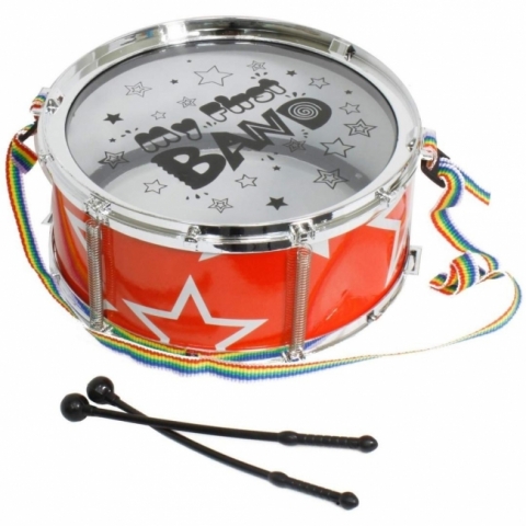 Bębenek Zabawkowy dla Dzieci "My First BAND" - Z Paskiem i Pałeczkami Wprowadź swoje dziecko w świat muzyki z tym uroczym bębenkiem! Ten zabawkowy instrument jest doskonałym pierwszym krokiem do rozwijania pasji muzycznej i poczucia rytmu u najmłodszych. Idealny do domowego tworzenia muzyki i pierwszych występów. Cechy produktu: Kompletny zestaw: W skład zestawu wchodzi bębenek, dwie czarne pałeczki perkusyjne oraz regulowany pasek. Atrakcyjny design: Bębenek posiada jaskrawo-czerwony korpus ozdobiony białymi gwiazdkami. Naciąg bębenka jest przezroczysty, z motywem graficznym "my first BAND" i gwiazdkami. Srebrne obręcze dodają instrumentowi profesjonalnego wyglądu. Wygodne użytkowanie: Dołączony kolorowy, tęczowy pasek umożliwia zawieszenie bębenka na szyi lub ramieniu dziecka, co pozwala na wygodną grę i swobodę ruchu. Wartość edukacyjna: Gra na bębenku wspiera rozwój słuchu muzycznego, poczucia rytmu oraz koordynacji ruchowej i motoryki małej. Wielkość opakowania: 22x22x10 cm Ten zabawkowy bębenek to świetny sposób, aby zachęcić dziecko do eksplorowania świata dźwięków i rytmu.