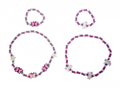 Komplet biżuterii dla dzieci – naszyjnik i bransoletka z kolorowych koralików. Występują różne wzory z motywami zwierzątek i kwiatków, wzór wybierany losowo. Cena dotyczy jednej sztuki. Produkt zapakowany w przezroczysty worek.Podane wymiary są wymiarami produktu w opakowaniu