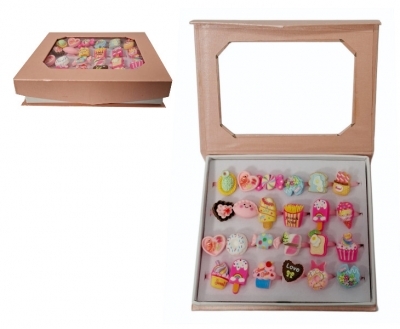 Zestaw pierścionków z kolorowymi motywami słodkości. W komplecie wiele różnych wzorów pierścionków np. lody, cukierki, babeczki. Zabawka zapakowana w eleganckie pudełko z magnesem. Podane wymiary są wymiarami pudełka.