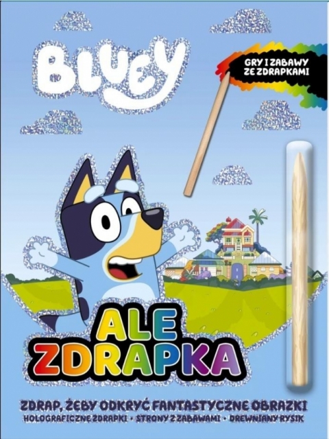 Zaskakująca przygoda ze zdrapywaniem! W środku Ale Zdrapka znajdują się czarno-białe obrazki do kolorowania, labirynty, barwne strony do zdrapywania oraz rysik. Dzięki niemu dziecko może odkrywać scenki z ulubionymi bohaterami, wystarczy, że zdrapie specjalną farbę, a pojawią się błyszczące strony lub pełne kolorów ilustracje. Blue i jej rodzina zapraszają do wspólnej zabawy!