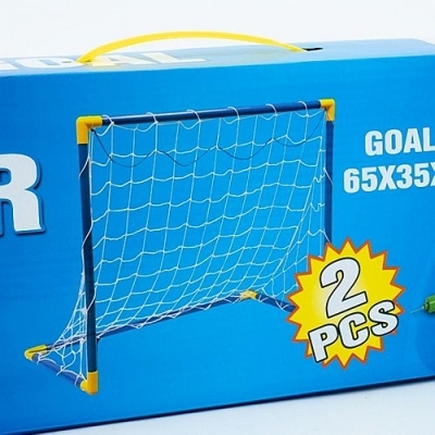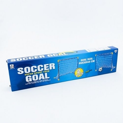 W zestawie znajdują się 2 bramki do samodzielnego montażu, piłka oraz pompka. Wymiary bramek po złożeniu 60x40x30cm. Produkty wykonane z plastiku, gumy oraz siatki.