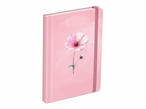 Wewnątrz znajdują się czyste kartki bez linii - bez z góry narzuconych zasad, tylko przestrzeń na własne zapiski i pomysły. Przednią stronę zdobi ilustracja różowego kwiatu na jednolitym tle.