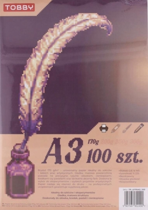 Brystol 170 g/m2 - uniwersalny papier idealny do szkiców i lekkich prac artystycznych. Gładka, matowa powierzchnia pozwala na precyzyjne rysunki ołówkiem, cienkopisami, kredkami czy pastelami oraz delikatne akcenty farb. Doskonały wybór do eksperymentów i szybkich projektów artystycznych. Papier nadaje się również do druku - na profesjonalnych urządzeniach gwarantuje wyjątkową jakość. Dodatkowe informacje: Idealny do szkiców i eksperymentów Gładka, matowa struktura Doskonały do ołówka, kredek, pasteli i cienkopisów Cechy: Białość CIE % 145 Szorstkość % 225 Bezdrzewny Wysoka gładkość Niepowlekany
