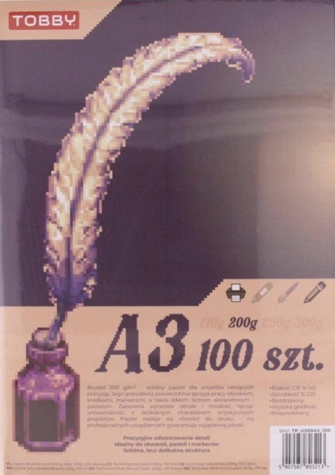Brystol 200 g/m2 - solidny papier dla artystów ceniących precyzję. Jego jedwabista powierzchnia sprzyja pracy ołówkiem, kredkami, markerami, a także lekkim farbom akwarelowym i pastelom. Zapewnia wyraziste detale i trwałość, łącząc uniwersalność z delikatnym charakterem artystycznych projektów. Papier nadaje się również do druku - na profesjonalnych urządzeniach gwarantuje wyjątkową jakość. Dodatkowe informacje: Precyzyjne odwzorowanie detali Idealny do akwareli, pasteli i markerów Solidna, lecz delikatna struktura Cechy: Białość CIE % 145 Szorstkość % 225 Bezdrzewny Wysoka gładkość Niepowlekany
