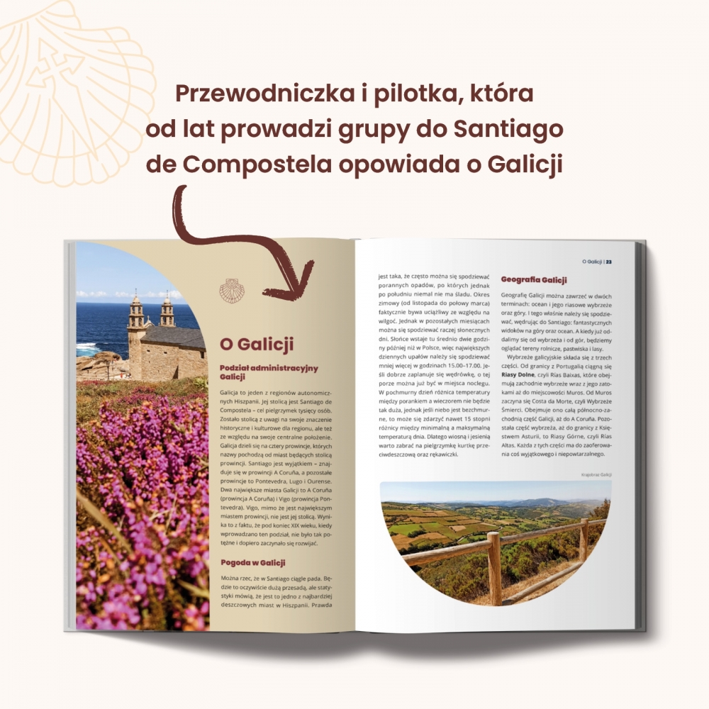 Eliza Szymaniak – przewodniczka i pilotka, która od lat prowadzi grupy do Santiago de Compostela i wymyśla niezapomniane programy pobytu w Galicji. Zapalona turystka wędrująca szlakami Camino oraz ekspertka od kuchni galicyjskiej.