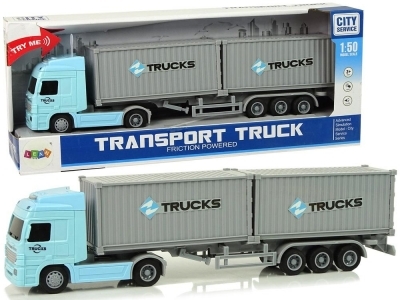 Autko wygląda jak prawdziwa ciężarówka. Realistyczny model wykonany został z dużą precyzją. Gwarantuje świetną zabawę oraz w bezpieczny sposób pozwala zapoznać mu się ze światem realnym. Na dachu ciężarówki znajduje się przycisk. Po naciśnięciu pojawiają się efekty świetlne i dźwiękowe takie jak odpalanie i odgłos pracy silnika. Wprawią twoje dziecko w lepszy nastrój, a i rozwiną zmysł słuchu i wzroku. Będzie dużo chętniej bawił się ciężarówką ! Porusza się napędem frykcyjnym. Wystarczy pociągnąć zabawkę po podłożu w tył i pojazd zacznie jechać. Podczas postoju można opuścić nogi dla stabilniejszej postawy. Odpinane naczepy dają wiele możliwości zabawy, w trasę można wyruszyć pojedynczo, z dwoma kontenerami bądź samą ciężarówką.