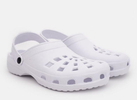 Clogi w kolorze białym. Clogi wykonano z bardzo miękkiego i lekkiego materiału, a zarazem trwałego. Są proste w czyszczeniu, a ich materiał nie wchłania wody, dzięki czemu szybko schną. Clogi wsuwane z dodatkowym ruchomym paskiem który zabezpiecza nogę przed wypadaniem.