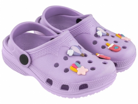 Urocze clogi dziewczęce w kolorze liliowym to idealne obuwie na lato - sprawdzą się zarówno w domu, jak i na zewnątrz, np. w ogrodzie, na plaży czy podczas wakacyjnych wyjazdów. Model został ozdobiony gumowymi pinami w kształcie lodów, balona i spadającej gwiazdki - po trzy na każdego cloga. Piny można dowolnie przekładać i umieszczać w otworach wentylacyjnych, co daje dziecku możliwość personalizacji i zabawy wyglądem obuwia. Clogi wykonane są z miękkiego, lekkiego i elastycznego tworzywa EVA, które zapewnia wysoki komfort noszenia, jest łatwe w czyszczeniu i odporne na wilgoć. Dzięki swojej lekkości buty nie męczą stopy nawet po wielu godzinach noszenia. Dodatkowo model wyposażony został w ruchomy pasek na piętę, który można przełożyć do przodu lub zostawić z tyłu - co pomaga utrzymać stopę we właściwym miejscu i zwiększa stabilność podczas chodzenia. Długość wkładki: 15 cm