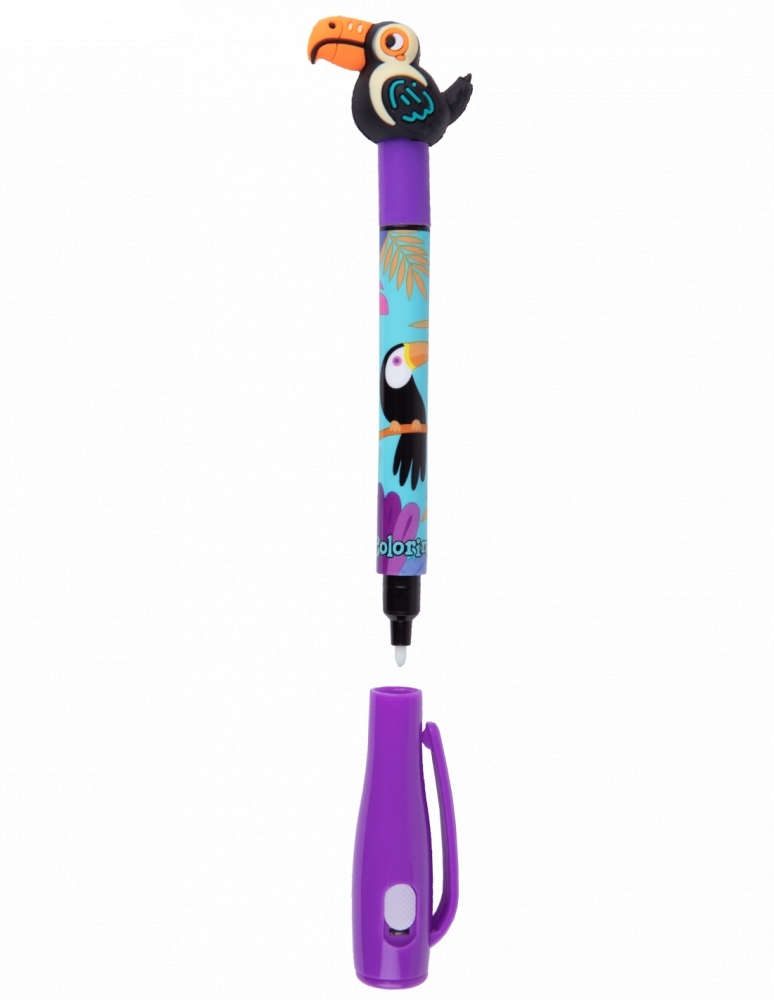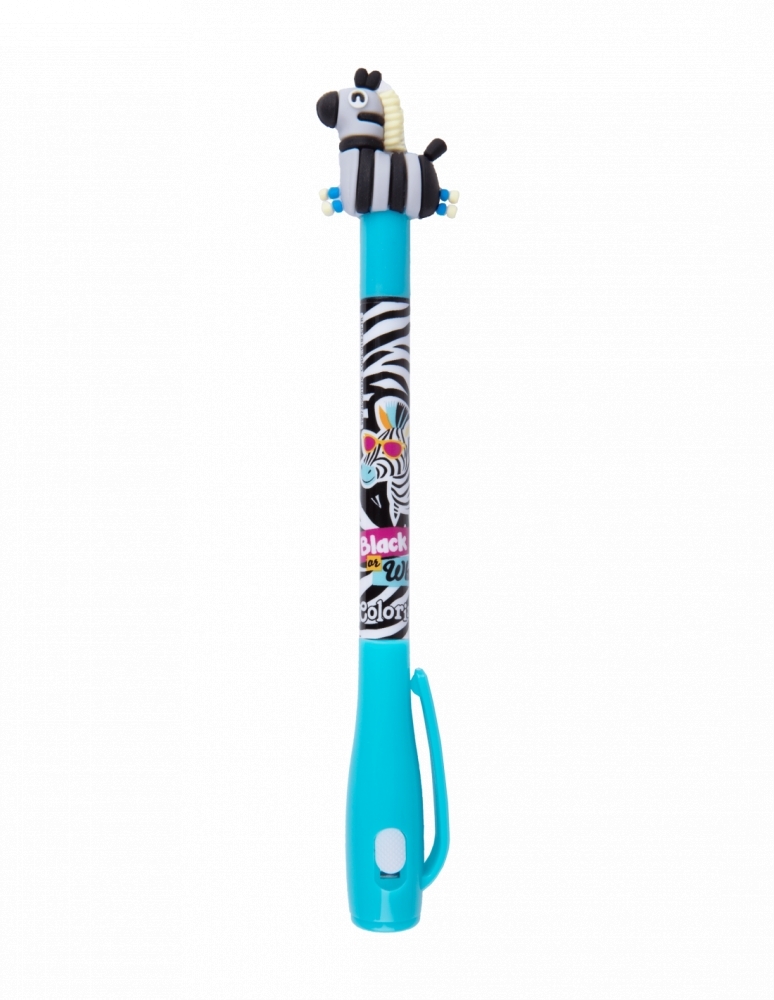 Ten wyjątkowy długopis z dwiema końcówkami to idealny wybór dla fanów kreatywnej zabawy. Końcówka z niewidzialnym tuszem pozwala tworzyć sekretne wiadomości, które ujawnią się pod światłem dołączonej lampki UV. Druga końcówka z klasycznym niebieskim tuszem 0,5 mm zapewnia precyzyjne pisanie na co dzień. Każdy długopis zdobi włochaty pompon w kształcie jednego z czterech uroczych zwierzątek: lamy, misia, tukana lub zebry, a kolorowa obudowa dodaje tropikalnego uroku.