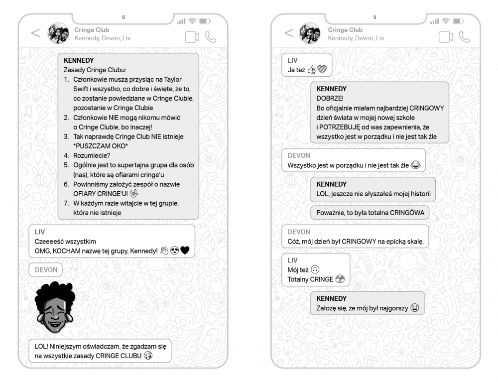 Mam na imię Kennedy King i zostałam ZMUSZONA przez mamę do przeprowadzki do Londynu. Właśnie zaczęłam naukę w Hellington High School (znanej również jako PIEKIELNA SZKOŁA). Jedyną DOBRĄ rzeczą w tej przeprowadzce jest to, że mama w końcu zgodziła się, żebym miała własny telefon (prezent z poczucia winy), dzięki czemu mogę utrzymywać kontakt z najlepszymi przyjaciółmi. Właśnie założyliśmy tajny klub. Nazywa się Cringe Club, ponieważ – jak pewnie się domyślasz – zawiera epicką dawkę cringe’u. Wchodzisz tu na własne ryzyko. I pamiętaj… to, co dzieje się w Klubie, ZOSTAJE w Klubie...