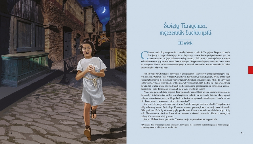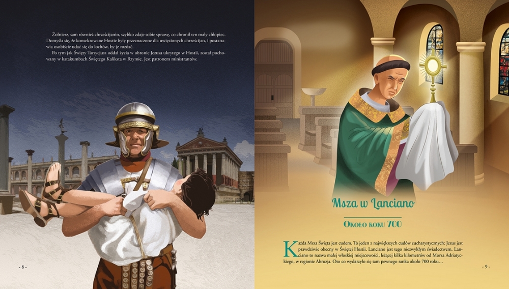 W historii Kościoła było wielu świętych zakochanych w Eucharystii. Czy chcecie przeczytać o cudach, których byli świadkami? Poznacie Świętego Tarsycjusza, który zginął śmiercią męczeńską, chroniąc konsekrowaną Hostię; Świętego Antoniego, który przekonał pewnego niedowiarka, że w Hostii naprawdę obecny jest żywy Bóg; Świętą Małgorzatę Marię Alacoque, którą Pan Jezus prosił, by jak najczęściej przyjmowała Komunię Świętą; Świętego Jana Bosko, w którego dłoniach rozmnożyły się komunikanty; Świętą Faustynę Kowalską, która ujrzała świetliste promienie wychodzące z konsekrowanej Hostii; Świętego Karola de Foucauld, który zachwycił się obecnością Jezusa w Najświętszym Sakramencie i wielu innych świętych, dla których Chrystus ukryty w konsekrowanej Hostii był całym światem.
