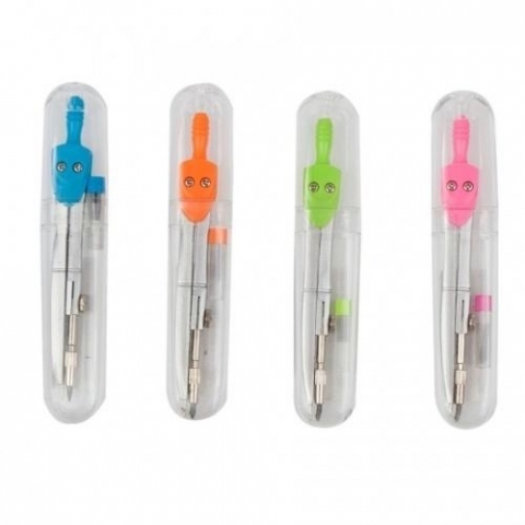 Metalowy cyrkiel w przezroczystym etui. W zestawie zapasowe grafity. Dostępny w kolorze niebieskim, zielonym, różowym i pomarańczowym.Wysyłka losowo.