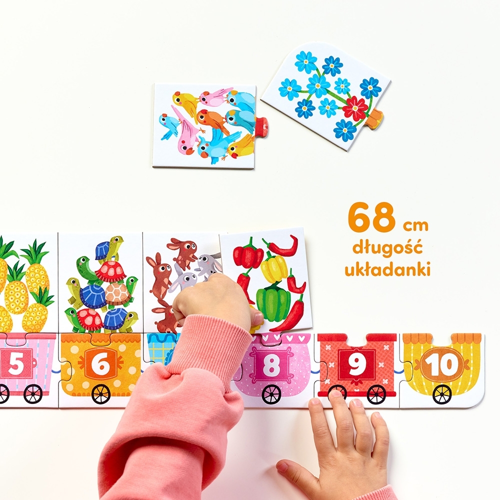 Długi (aż 68 cm!) puzzlowy pociąg przewozi kolorowe wagoniki, a w nich przeróżne zwierzątka, towary i rośliny. Aby ułożyć puzzle we właściwej kolejności, trzeba je dobrze policzyć! Dlatego zabawa nie tylko rozwija spostrzegawczość i małą motorykę, ale jest też pierwszą lekcją matematyki na wesoło. Edukacyjna podróż START!