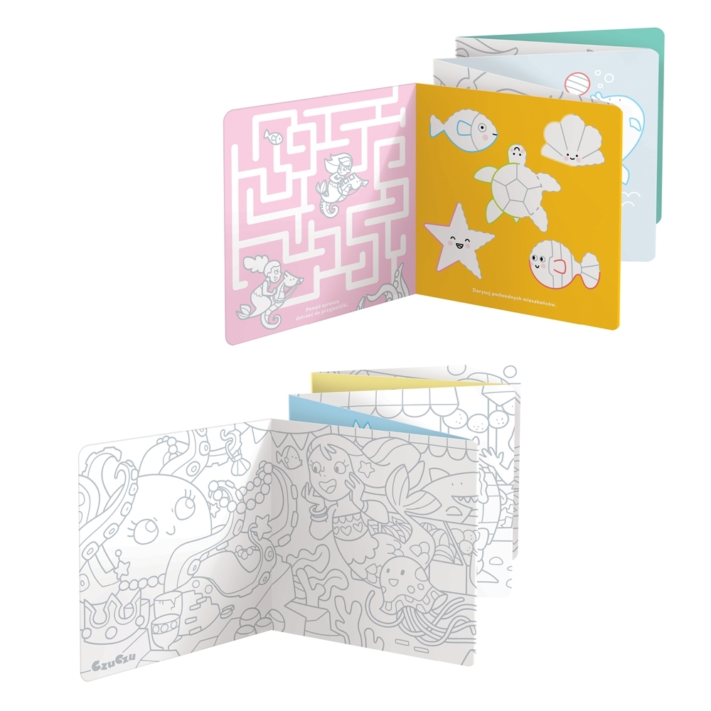 Kreatywny zestaw zawiera 2 długie książeczki harmonijki z 2 panoramicznymi kolorowankami oraz mnóstwem kreatywnych i edukacyjnych zadań.