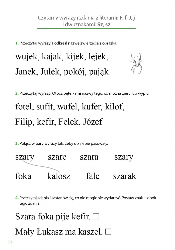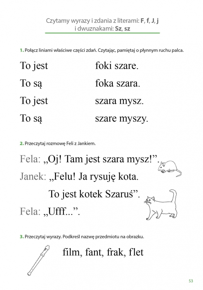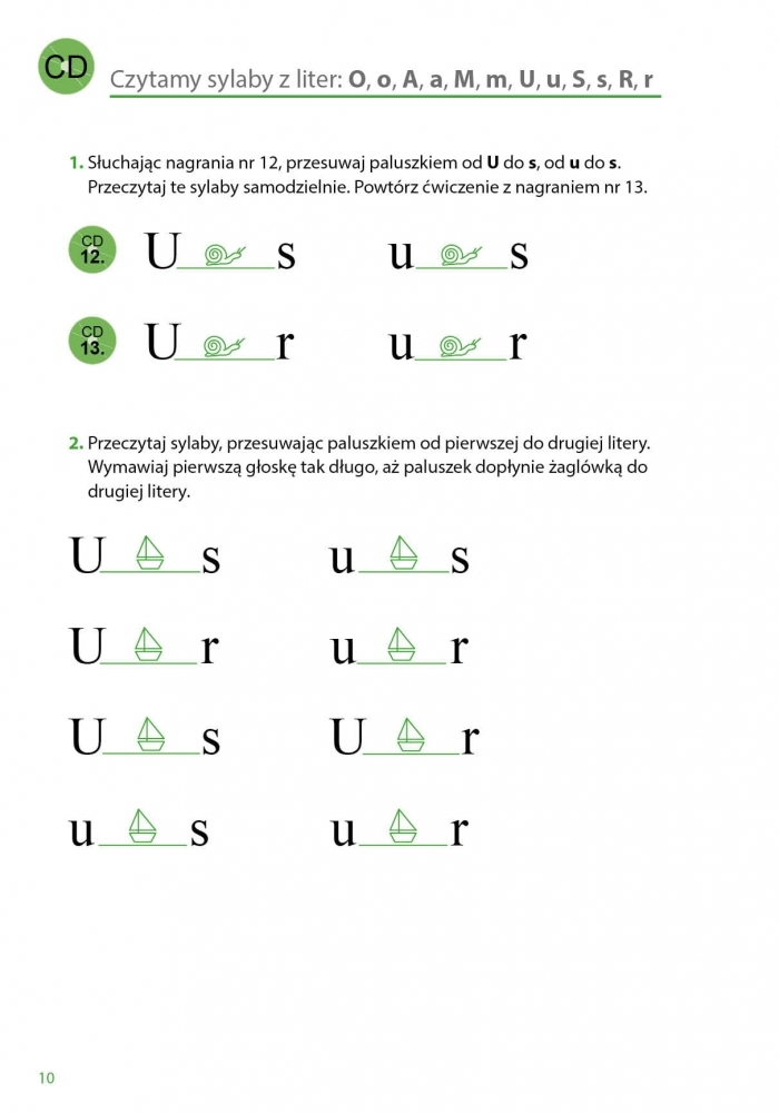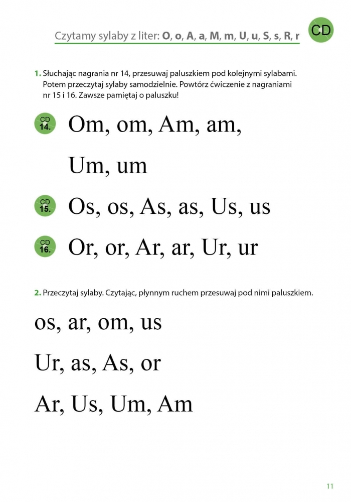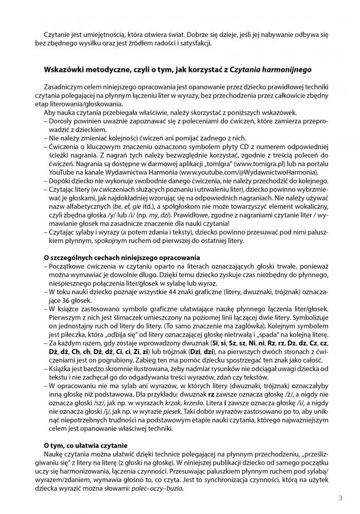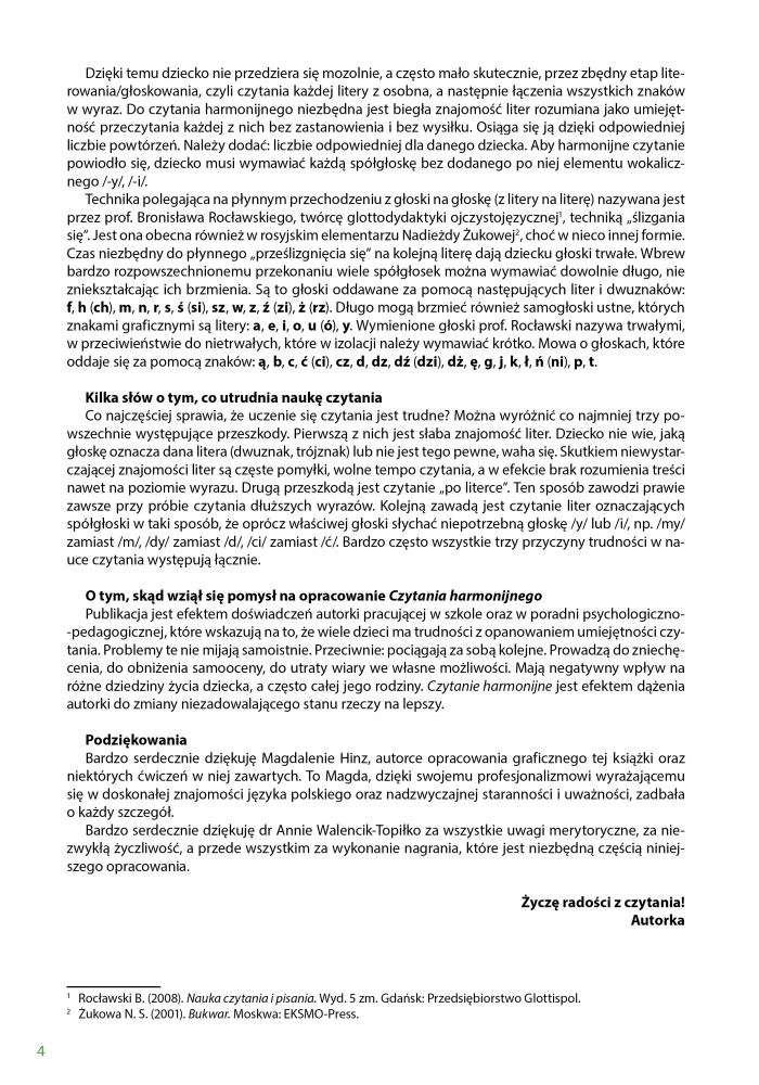 W toku nauki dziecko poznaje wszystkie 44 znaki graficzne (litery, dwuznaki, trójznak) oznaczające 36 głosek. Początkowe ćwiczenia w czytaniu oparto na literach oznaczających głoski trwałe, ponieważ można wymawiać je dowolnie długo. Dzięki temu dziecko zyskuje czas niezbędny do płynnego połączenia liter/głosek w sylabę lub wyraz. W prezentowanym opracowaniu nie ma sylab ani wyrazów, w których litery, dwuznaki i trójznak oznaczałyby inną głoskę niż podstawowa. Taki dobór słów zastosowano po to, aby uniknąć niepotrzebnych trudności na tym etapie nauki czytania, którego najważniejszym celem jest opanowanie właściwej techniki.