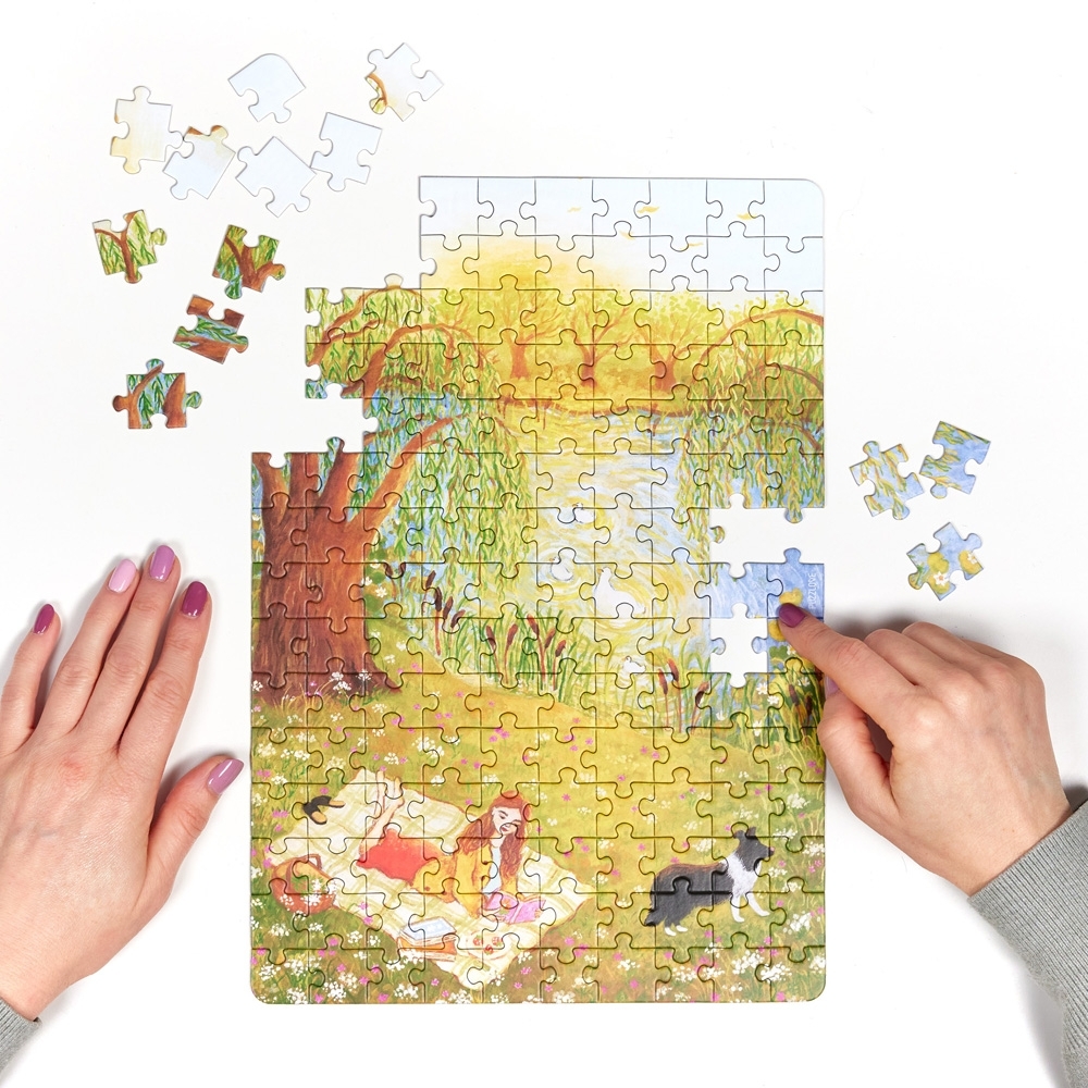 Puzzlove Czytanie na trawie to zaproszenie do wypoczynku w 150 elementach. Puzzle zapakowaliśmy w urocze poręczne pudełko. Ich wielkość po ułożeniu oraz liczba elementów – nie za dużo, nie za mało – sprawiają, że te puzzle świetnie sprawdzą się jako puzzle “na raz” dla dorosłych oraz trudniejsza układanka dla starszaków.