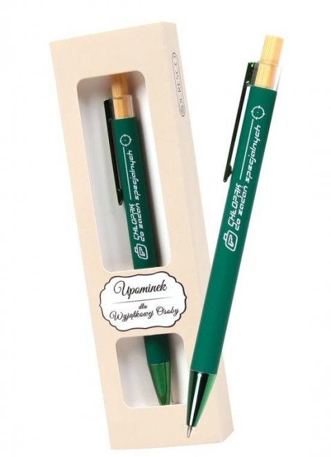Metalowy, automatyczny długopis DYPLOMAT z nadrukiem Chłopak do zadań specjalnych - jako prezent na różne okazje dla chłopaka, nie tylko na Dzień Chłopaka. Długopis koloru zielonego z wymiennym wkładem typu zenith. Zapakowany w prezentowe etui.