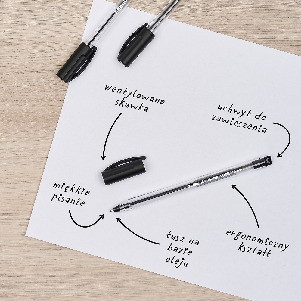 Długopis Pelikan Hang Stick to praktyczne i niezawodne narzędzie do codziennego pisania, które łączy wygodę użytkowania z funkcjonalnymi detalami. Dzięki ergonomicznemu kształtowi o przekroju zbliżonym do trójkąta, idealnie dopasowuje się do dłoni, zapewniając komfort nawet podczas długiego pisania. Tusz na bazie oleju gwarantuje miękki i płynny ruch po papierze. Co go wyróżnia? Specjalny uchwyt na końcówce, który umożliwia zawieszenie długopisu lub przymocowanie go do wybranego przedmiotu – idealne rozwiązanie dla miejsc, gdzie pisak powinien być zawsze na swoim miejscu. Wentylowana skuwka zwiększa bezpieczeństwo, a jednorazowa konstrukcja sprawia, że jest gotowy do użycia i nie wymaga wymiany wkładów.