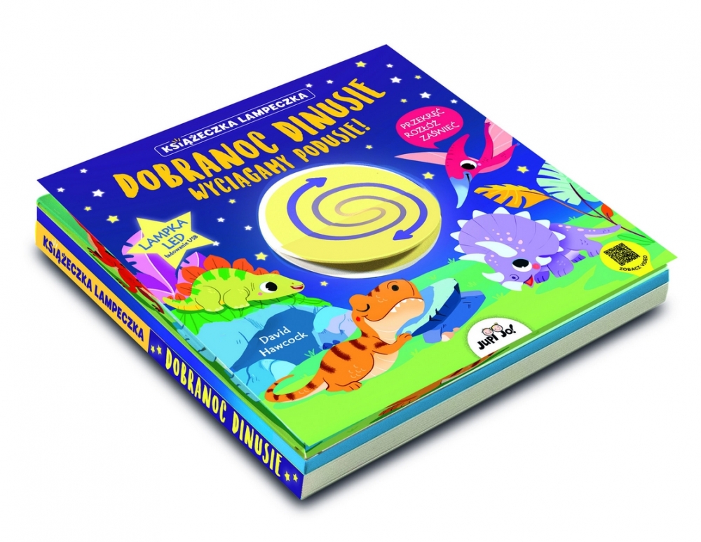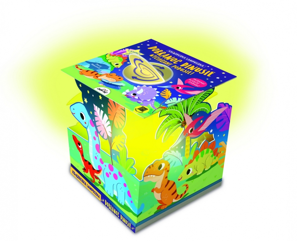Wystarczy przekręcić i pociągnąć okrągły element na okładce, a sypialnia maluszka natychmiast się rozświetli! W książce znajduje się osiem słodkich rymowanek o dinozaurach, które pomogą dzieciom przygotować się do snu, a delikatne światło lampki będzie towarzyszyło im podczas zasypiania. Fluorescencyjne detale na okładce pozwolą zobaczyć książkę nawet w ciemności!