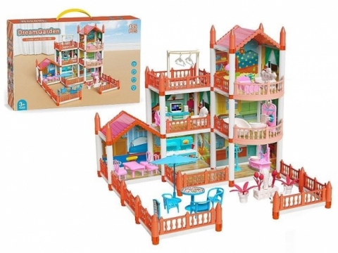 domek 2 piętrowy dla lalek 53x51,5x47cm, z wyposażeniem i ogrodzeniem; 45,5x30x11cm, Box
