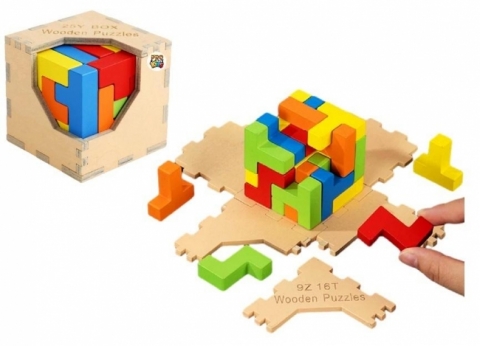 Zadaniem gracza jest ułożyć wszystkie elementy w przestrzeni tak, aby zmieściły się w drewnianej skrzynce to doskonałe ćwiczenie logicznego myślenia, wyobraźni przestrzennej i cierpliwości. Kolorowe klocki w odcieniach czerwieni, zieleni, żółci, niebieskiego i pomarańczowego pomagają również w nauce rozpoznawania barw i kształtów.