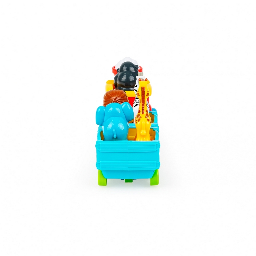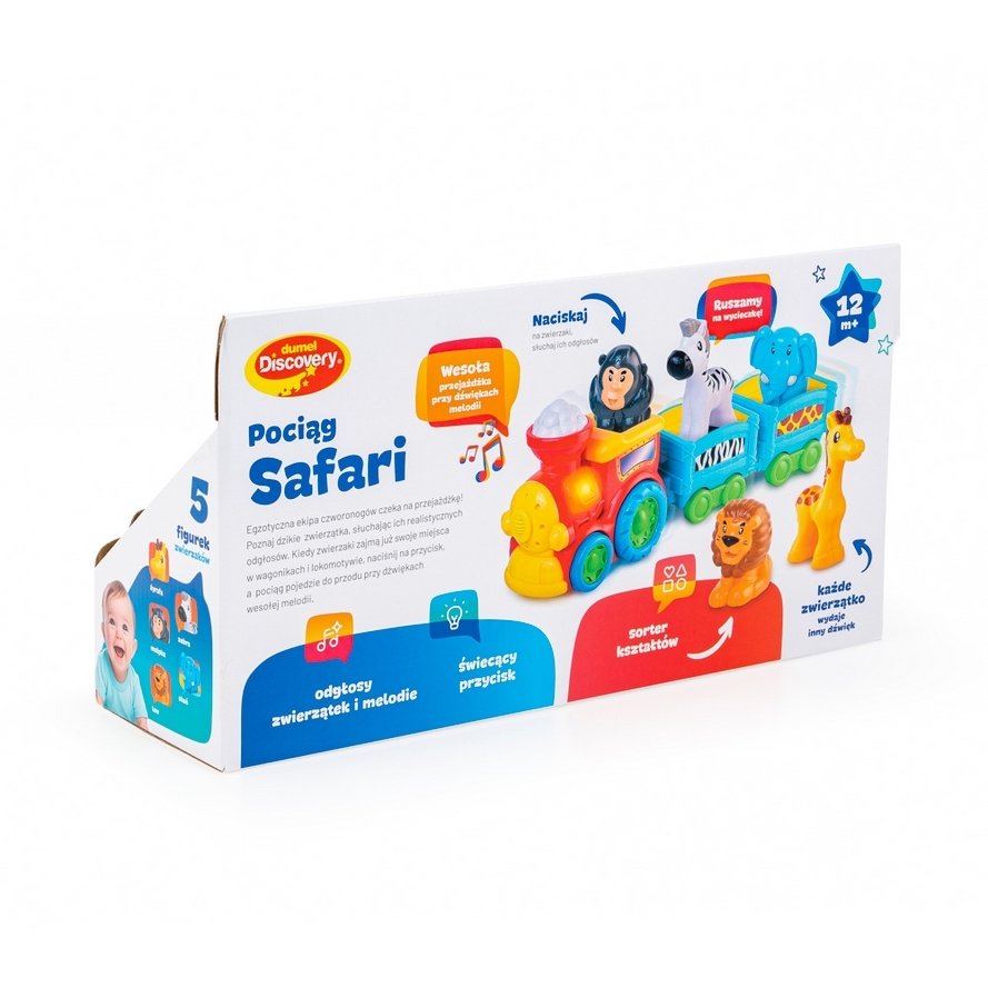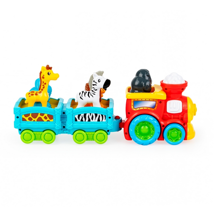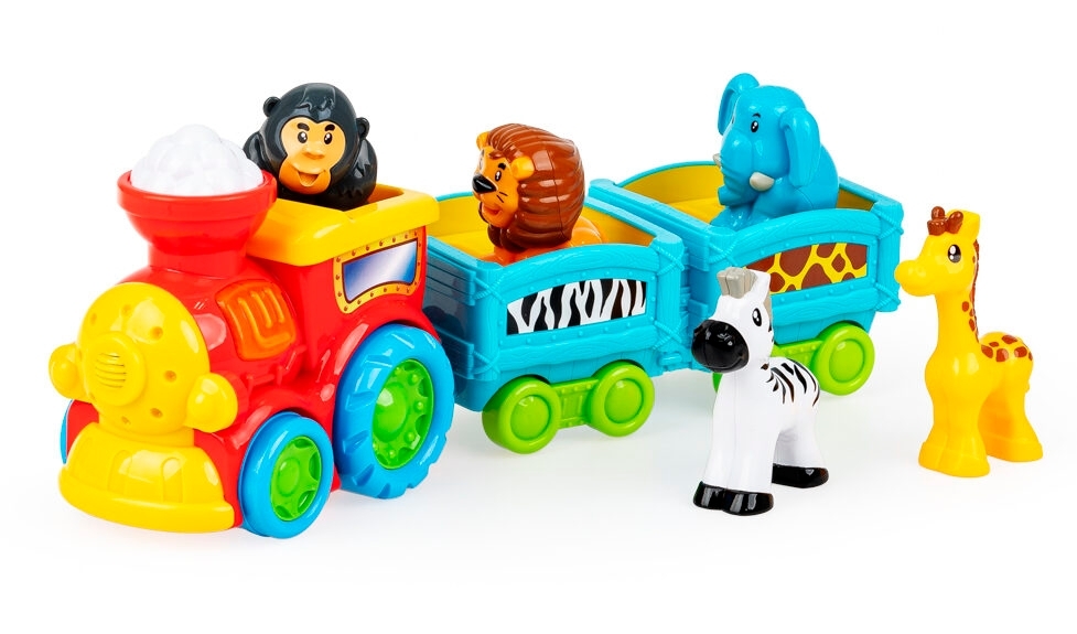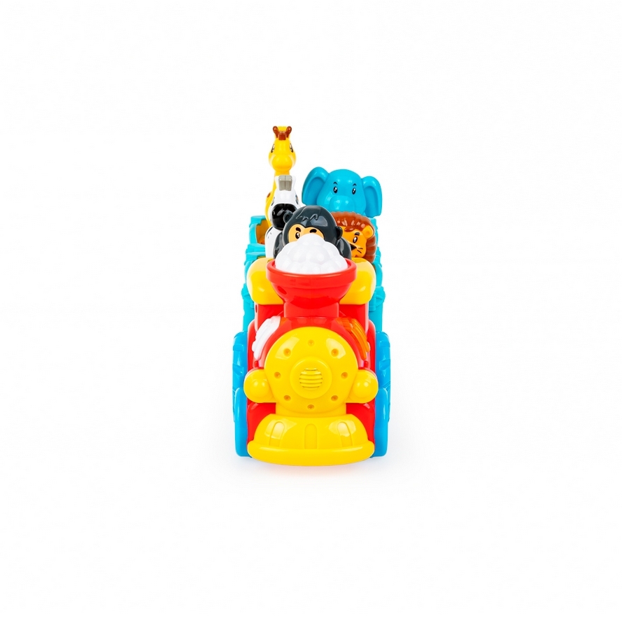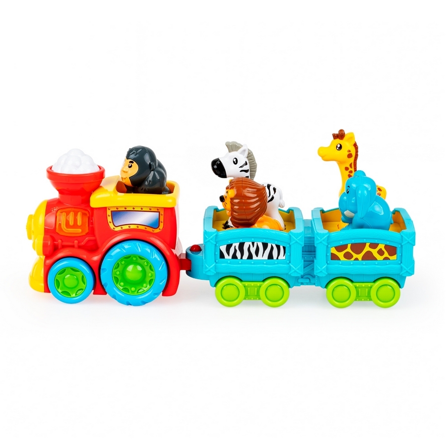 Ciuchcia z dwoma wagonikami wiezie dzikich pasażerów, a każde z pięciu zwierzątek ma w tym kolorowym składzie swoje miejsce! Umieść czworonożnych pasażerów na odpowiednich siedzonkach, aby posłuchać egzotycznych odgłosów. Pociąg wyposażony jest w świecący przycisk, który uruchamia realistyczny dźwięk i funkcję jazdy do przodu. Przejażdżkę umili wesoła melodia.