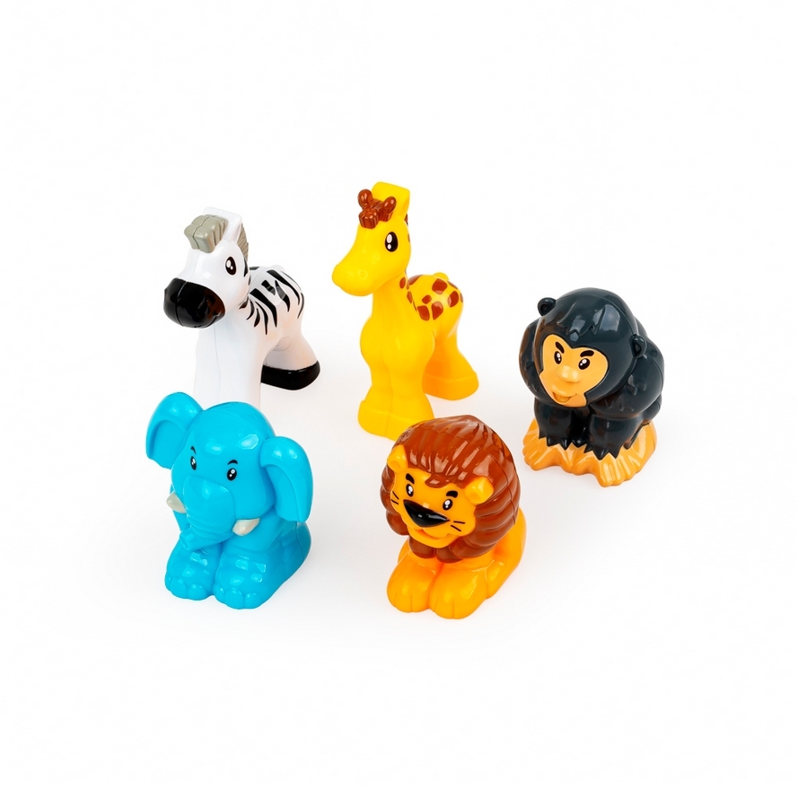 - w zestawie 5 figurek zwierzaków: lew, słoń, małpka, zebra, żyrafa;