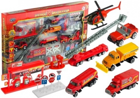 Zestaw pojazdów strażackich + akcesoria w skali 1:64Ten zestaw będzie wielką gratką dla wszystkich młodych fanów dzielnych i nieustraszonych strażaków. Zestaw składający się z imponującej liczby 30 elementów skrywa w sobie zarówno różnorodne pojazdy, jak i elementy konieczne do aranżacji świetnej zabawy. Co ważne, samochody, znaki drogowe i pozostałe elementy wchodzące w skład kompletu inspirowane są realnymi, pełnowymiarowymi przedmiotami, przedstawionymi w skali 1:64.Zabawki wykonane są z połączenia plastiku i metalu, dzięki czemu są bardzo solidne, wytrzymałe, a zarazem bezpieczne w użytkowaniu. Całość zachowana jest w charakterystycznej dla straży pożarnej kolorystyce, składającej się z czerwonej barwy. W zestawie dziecko znajdzie elementy pozwalające na świetną zabawę ? maluch będzie mieć do dyspozycji helikopter, naczepę z długą, wysuwaną drabiną, pięciu pojazdów, a także figurki strażaka i elementów bezpieczeństwa ? pachołki i znaki drogowe.Dlaczego warto wybrać ten zestaw? Mnogość elementów wchodzących w skład tego kompletu umożliwia wspólną zabawę i pozwala na to, by dołączyły do niej inne dzieciaki bądź rodzeństwo ? z pewnością będzie jeszcze bardziej pasjonująca, a jej scenariusz zaskakujący. Ponadto zawiera w sobie wszystko, co jest wymagane do udanej zabawy.Wymiary wybranych zabawek:- naczepa z drabiną: 17,5 cm x 5,5 cm,- drabina wysunięta: 29 cm,- ciężarówka: 10,5 cm x 5,5 cm,- samochód terenowy: 8 cm x 5 cm,- stacja paliw: 13 cm x 7 cm,- stojak ze znakami drogowymi: 11,5 cm x 4,5 cm.Wymiary opakowania:- 45 cm x 5,5 cm x 28,5 cm.